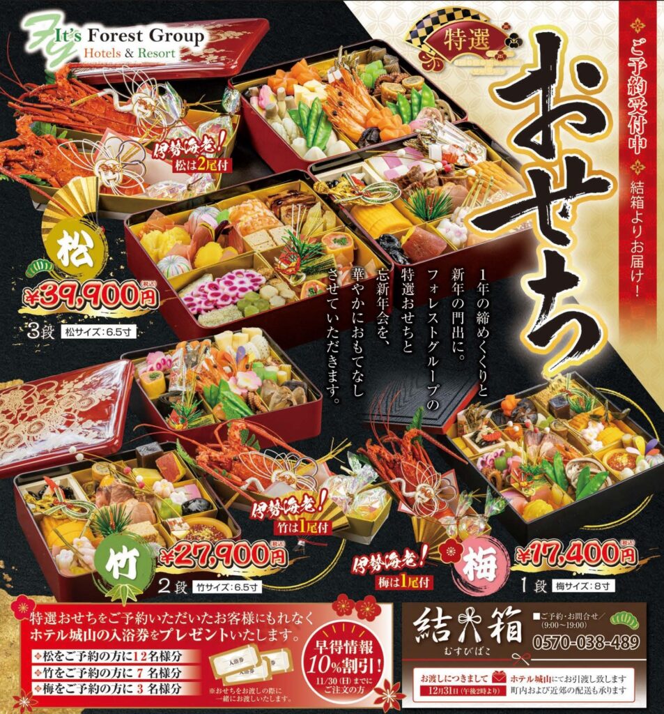 ◆フォレストグループの“特選おせち”は、厳選された高級食材や縁起の良い食材を取り揃え、日本料理の伝統と技を駆使し、素材の味を最大限に引き出したお料理です。迎春にふさわしい極上のおせちは、見た目も豪華で、色合いも美しく、ご満足いただける内容となっております。また11月30日(土)までにご注文いただいた方には「早得10%割引」に加え、ホテル城山の入浴券ももれなくプレゼントいたしますので、お早めにご注文ください。